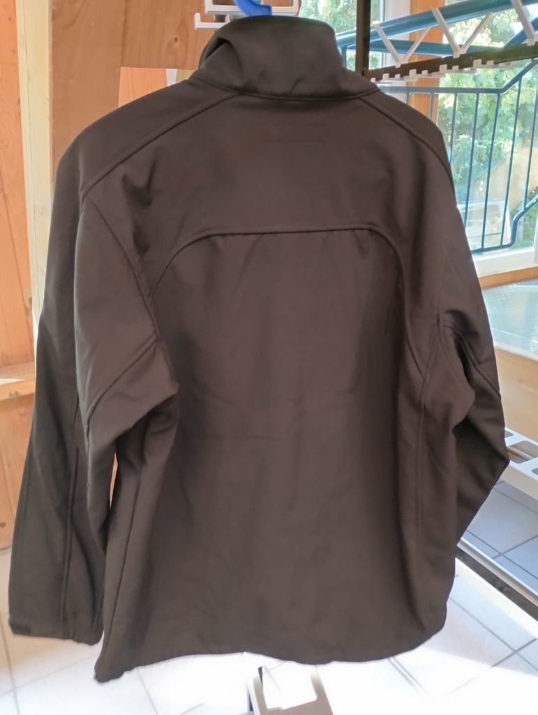 schwarze Softshelljacke mit Logo vorne: Preis 80 €
