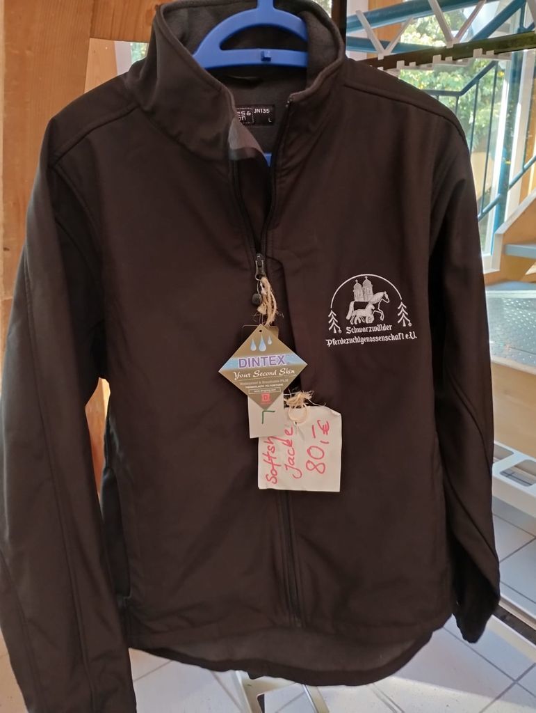 schwarze Softshelljacke mit Logo vorne: Preis 80 €